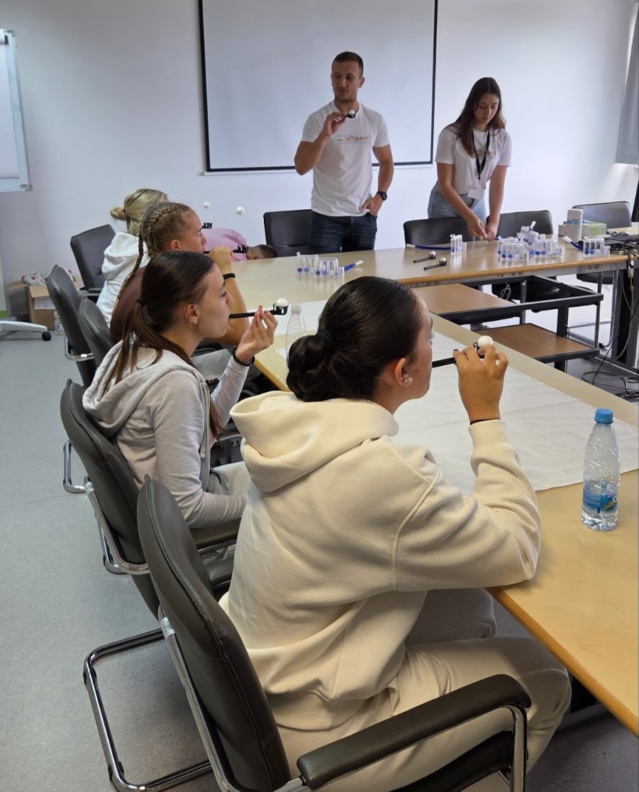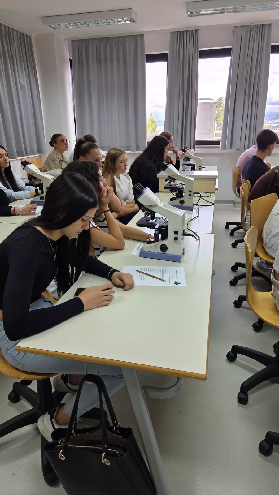 V petek, 26. 9. 2025 smo se z dijaki 2. letnikov Ekonomske gimnazije in Ekonomskega tehnika udeleżili raznolikih delavnic v okviru dogodka Evropska noč raziskovalcev. Delavnice so potekale na Fakulteti za vede o zdravju UP. Merili smo svoje dihalne sposobnosti in telesno zmogljivost, se preizkusili v mikroorientaciji v prostoru, preverjali učinkovitost umivanja rok pod UV svetlobo, se preizkusili v skupinski gibalni koordinaciji, ugotavljali pomen čutil pri uživanju hrane in prepoznavali skrivni svet pod mikroskopom